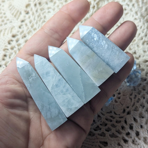 Aquamarine (blue Beryl) Mini Generators~CRAQMG20. Aquamarine is known for its ability to stabilize and harmonize unsettled surroundings. It filters out unnecessary information, sharpens the intellect, and calms the nerves. It is known as a stone of courage, reducing fears, and is especially helpful for sensitive people. It sharpens intuition, better enabling you to interpret your emotions. It increases creativity and brings about a tolerance of others, emitting a gentle and compassionate energy supporting moderation. Aquamarine aids deeper meditation, quiets the mind, and brings about a tolerance of others. It will also help to attune you to nature and to more spiritual levels of awareness, enhancing connection to source/creator. It is known to bring order out of chaos to people feeling overwhelmed by responsibilities, like the weight of the world is on your shoulders. It lends one the courage and clarity to express one’s inner knowing. It helps free oneself of attachments to old patterns, relationships and ways of being. It can assist those who keep emotional scorecards or grudges to let go of the past. It is an excellent stone for working with grief, as it assists one in fully releasing attachment to the body of a loved one, while retaining a positive emotional connection to the loved one’s spiritual being. It helps one understand where one is holding on to emotions, communication patterns, or thoughts that are limiting one’s ability to “go with the flow”. It can help one identify where ego is causing one to overreact, assume a victim, abuser, or rescuer role, act in a passive-aggressive manner, manipulate others, or martyr oneself. By identifying these patterns and consciously releasing them, one can raise one’s relationships and communication to a level that is more reflective of Divine Love and compassion. It also assists one in clearing patterns caused by past emotional, physical or verbal abuse. It is an excellent stone for people who have been through traumatic situations and have disassociated from their emotional bodies. One of the most powerful properties of this stone is in aiding and raising communication to a higher level, and encourages a "go with the flow" attitude. One (1) Aquamarine Mini Generator. Size varies as per pictures.