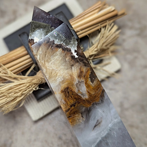 Fluorite, Scolecite & Pyrite Generator (RARE)~CRFSPG04. Purple Fluorite is said to be the most peace-giving color of Fluorite. It is dedicated to the devotional aspects of the mind that connect with Spirit, enhances mental acuity, stimulating the Third Eye Chakra in order to bring a logical & conscious awareness of the mental processes & how one thinks, an excellent crystal for focused meditation & boosts one’s intuitive & psychic abilities, a stone of protection, thought to become more protective the longer it is used, an ideal “Dream Crystal,” defending one from evil spirits & bad dreams, emanates a marvelous energy throughout the light body relieving stress, spiritual discomfort, & physical blockages, considered highly therapeutic for those who are uncomfortable being touched or examined, a dream talisman, providing insight & giving us a window to the soul beyond ordinary understanding, not only the wisdom of self, but focuses on our feelings & understanding our hidden yearnings. Yellow Fluorite may be used for finding “that which is lost”,wonderful for those with overactive imaginations, helping one understand the fine line between attainable dreams & illusions, particularly empowering for overcoming self-defeat or a constant need to compare oneself unfavorably with others, a crystal of unity, intellect and creativity, ideal for cleansing & repair of the auric field, & for activating & energizing all chakras, calms a chaotic mind, meditating with this mineral can help reveal the truth of a relationship, an excellent ally for “Indigo Children” to experience simplicity, safety & love on this dimension. Scolecite is Crown & Soul Star Chakra stone connected to psychic abilities, akashic records, journeying, meditation, & channeling spiritual messages, considered a stone of serenity, resonates with the Reiki symbol Hon Sha Ze Sho Nen, assisting healing sessions, & breaking through the illusory constructs of time & space, acts as an energetic bridge between the heart chakras of romantic partners.Yang energy is outward-focussed, whereas Yin energy is inward-focussed, & promotes self-love & self-healing. If you have spent a significant amount of time in Yang environments, such as high-powered work environments or social events, you may need a good dose of the Yin energy of a stone like scolecite to “recharge.” This is especially important for people who are introverted – that is, who gain their energy from being alone, will speed up the recharging process, helping you gather your energy & calm yourself so that you are focussed & ready for your next social or Yang-focussed activities. Pyrite encourages the flow of Earth energy (a purifier) into the body, increasing physical stamina and mental acuity, aids the process of manifestation & creation on all levels, nicknamed "fools gold", reminding us that "money isn't everything”, assists us in balancing creativity with logic, asks us to employ our "male energy”, & is considered the masculine power stone, a very protective stone, keeping out negative vibrations, shielding on a physical level from harm, repelling pollutants, while energizing the nourishing energies of the body, allows one to recognize the purity of the universe & to understand that each portion (or person) of the universe maintains an inherent perfection in order to allow the unfolding of impeccability, encourages the flawless ideal of health, intellect, & emotional well-being, symbolizes the warmth & lasting presence of the sun & promotes the recall of beautiful memories of love and friendship, assists one in seeing behind facades, promoting understanding of that which lies beneath words & actions. It is also helpful in enhancing memory. 153mm x 33mm x 34mm.