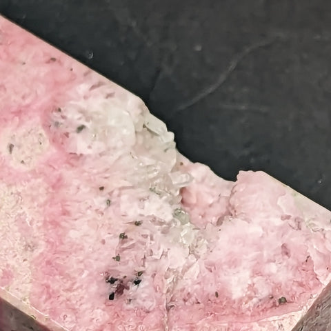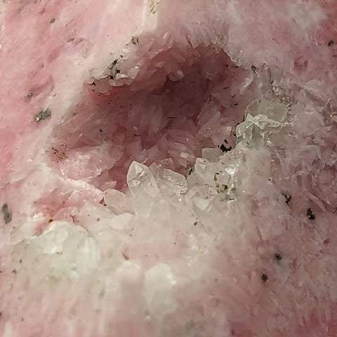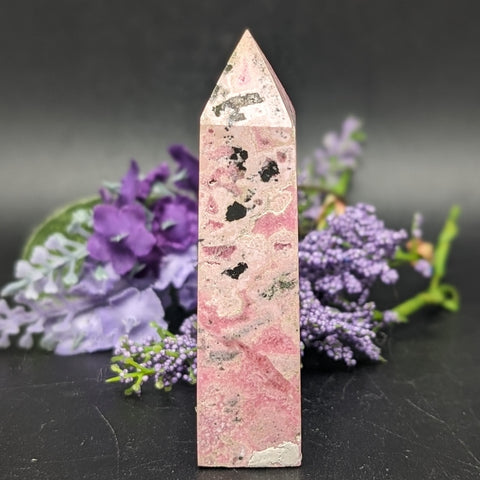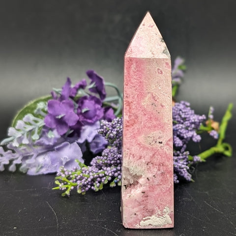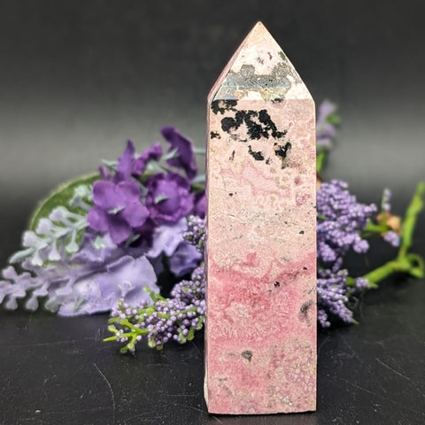 Rhodochrosite Tower~CRRHCG05. Rhodocrosite is considered "a stone of love and balance". It emits a strong powerful love...creating new worlds for the wearer, worlds filled with love and dreams. It also allows us to serve the planet in her time of need. It improves self-love, self-acceptance, and self-trust, for the purpose of emotional healing. It assists in doing the necessary work of recovering, reliving and releasing the memories of one's emotional wounding. If there were moments in infancy, childhood, or even past lives in which one experienced physical or emotional violence, severe shaming, or was otherwise thrown into a traumatizing emotional situation, the result can be a fixation of a portion of one's life force energies at that point. To cope, a person may make severe compromises for survival's sake. Inner gifts and talents may be abandoned, repressed and forgotten. In addition, the energy it takes to keep these memories repressed can be a serious drain on our vitality. This stone helps the heart chakra to feel painful feelings without shutting down. Through its vibration of inner piece, joy and forgiveness, it allows one to fully blossom and to re-enter the sense of Grace and magical happiness that are natural in a child that feels safe and loved. Rhodocrosite assists the removal of denial and helps one to accept and assimilate new information. It encourages the optimum state of health, and is very helpful in balancing the thyroid and purifying the circulatory system. It is especially helpful in healing emotional wounds that were formed during childhood, and is an excellent stone for healing sexual abuse. This is a stone that insists you face the truth, about yourself and other people, without excuses or evasion but with loving awareness. This stone clears the solar plexus and base chakras gently bringing painful and repressed feelings to the surface allowing them to be acknowledged and then dissipated through emotional release. Known to attract ones soul mate. It help s to clear and purify the base, solar plexus and heart chakras. The message of rhodocrosite is to help you reconnect with your inner child, to clear the energy of old wounds so you may live in the present and interpret those experiences with new vision, and to reconnect with your joy, creativity, and childlike faith in a higher power. 73mm x 21mm x 18mm