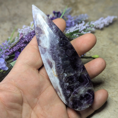 Standing Amethyst "Flame"~CRAMFLM1. Amethyst is said to be a "stone of spirituality and contentment". It encourages conscious connection with our Higher Self and Divine Mind, allowing understanding of the spiritual lessons of the situations you have created to become apparent. It also transmutes lower energies( rage, jealousy, fear) into higher energies of patience, tolerance, self acceptance, faith. Amethyst bestows stability, strength, invigoration, and peace; the peace being the perfect peace which was present prior to birth. Because of the calming effect it is an excellent stone for meditation. It promotes fairness and flexibility in decisions and enhances the ability to manage responsibilities. It helps sooth ones temperament, and helps ones business prosper. Amethyst aids in opening ones mind to new ideas, new emotional attitudes, and new depths of spirituality. It is said to encourage sobriety, and is helpful for freeing one from addictive personalities. The message of amethyst is to pay attention to messages your Higher Self may be sending you, maybe a new book, new job, new relationship-with another, with yourself, or with your spirituality, and to be open to Divine guidance. 131mm x 43mm x 20mm