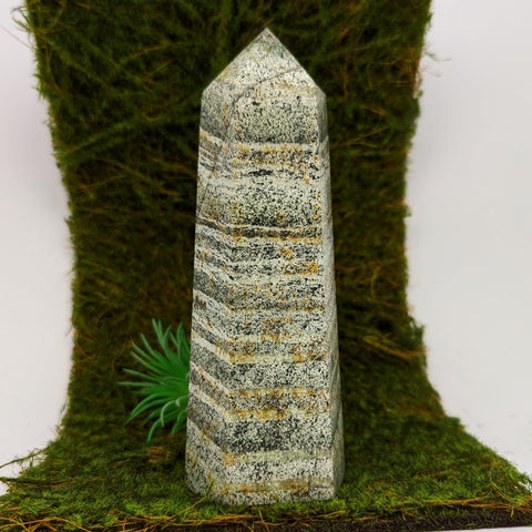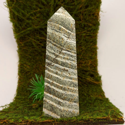 Chrysotile in Serpentine Pillar~Large~CRLCSRP3. Chrysotile in Serpentine can be used to bring a bonding action between one and the subject of one’s desires, such that one may easily release the object whenever the need has been fulfilled, assists one in “finding” the “true” self by clearing the “baggage”of the past, assists one in the release of control over others, and assists one in maintaining control with respect to ones life, an excellent tool for accessing and connecting with your power animal. For Gaia Healing, it may be placed in an area of disturbed Earth energy, can help you to steer your own destiny, when placed over the thymus, it works on the etheric blueprint to correct imbalances and blockages that could manifest as physical disease and to heal cellular memory, one of the best stones for rousing the kundalini energies-the “serpent power” said to reside at the base of the spine-when the kundalini is awakened, individuals may experience a wide range of psychic and spiritual phenomena, a powerful stone for working energetically to bring the old reptilian part of the brain into the service of the higher brain, soothing to the emotional body, allowing one to release fear of change and hardship and to look ahead to the future with expectation and excitement. 157mm x 57mm x 50mm