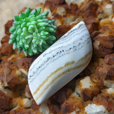 Dendritic Yellow Calcite Palm Stone~CRDYCP11. Dendritic Yellow Calcite. Dendrites are fern-like inclusions of manganese, that create bold or fern-like patterns within the gem. It has been called the "Blessing Stone". The dendrites of manganese act as antennas to bring a connection between the conscious self and the angelic realm. The vibration of manganese also brings a "quickening" to the response time in sending to, and in receiving messages from, the angels. This is a stone of clarity, and will allow you to see things as they are and not what they appear to be. Manganese is an excellent anti-procrastination/motivational stone. It is said to provide increasing inspiration, motivation, and energy the closer one gets to the completion of a goal. It also has a grounding effect which can balance and ground one during times of stress. It is considered “the love element”, encouraging love, especially between parent and child. Yellow Calcite is associated with the solar plexus, self confidence and hope. It is said to be effective at clearing out old energy patterns and increasing personal motivation and drive. Yellow Calcite specifically is a clearer of accumulated self doubt, giving you the opportunity for a clean emotional slate. It is also known as a mind stone as it heightens mental discernment and analysis, increases memory and the ability to learn quickly and efficiently, great for students! It is a powerful energy amplifier. It is said to purify and clear negative energy, and negative emotional debris from shame and anger. 64mm x 27mm x 17mm