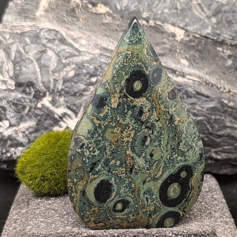 Kambaba Jasper "Flame"~CRKJGSF9. Kambaba Jasper (Green Stromatolite) is fossilized algae & is the primary constituent of the fossil record for about the first 3.5 billion years of life on Earth, they are almost our only glimpse into deep time on earth, the emergence of life, and the evolving of the beautiful forms of life of modern time, a small piece of stromatolites encodes biological activity perhaps spanning thousands of years, aids past-life meditation, said to relieve physical and emotional stress & reestablish the flow of body fluids that have become heavy, blocked, or dried, is said to mystically soothe the nerves and state of mind, good for grounding and protection, beneficial for plant growth and health, helps dietary stabilization, assimilation of vitamins and minerals, and cleansing the body of toxins. 78mm x 50mm x 17mm