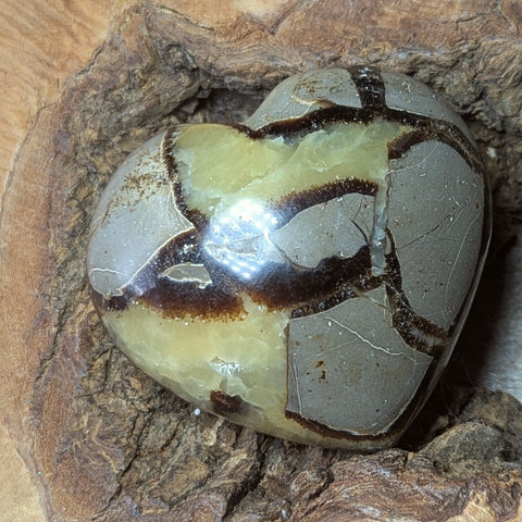 Septarian Nodule Heart~CRSNHRT1. Septarian Nodule has been used to enhance the gift of speaking such that one may speak to an audience in an individualized, personal manner, In drumming circles which are being used for healing, it helps focus and resonate the vibration, assisting in the direction of the energy of the mineral to penetrate the area which one desires to be healed. It has also been used to facilitate and to enhance neuro-linguistic programming(NLP It assists one in "always being prepared", provides for ease of centering oneself and is especially helpful during periods of stress and anger during the preparation for the state of meditation. It can also provide for insight into the basis of the problems which one confronts on the physical plane and can stimulate communication on the higher planes. Septarians enhance one's patience and helps to "maintain" comfortably during conditions requiring the acceptance of an abundance of responsibilities. It is also an energy amplifier, and is said to help one remember the state of perfection during dis-ease in order to return to the natural state of flawless-ness. It is a world teacher for all of humanity, facilitating macrocosmic awareness and appreciation of the creative forces of nature. It is an excellent stone when studying the arts and sciences. 63mm x 57mm x 35mm