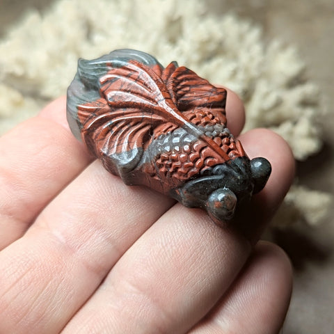 African Bloodstone Koi Carving~CRBSKOI5. In most Japanese cultures, koi represent a material and spiritual abundance or advancement. In Japanese, "koi" is a homophone for another word that means "affection" or "love", so koi are symbols of love and friendship in Japan. In Feng Shui, a spiritual form of organization and placement of objects, says that having the spirit of the koi near you will attract good luck, fortune, and spiritual benefits. Koi fish typically symbolize good luck and fortune because legend has it that koi can climb the falls of the Yellow River to become a dragon. Through perseverance and endurance, the carp were able to become mythical beings. Two thousand years later and the Koi fish still symbolize perseverance and endurance. Koi often symbolizes a persons aspirations to improve themselves. Bloodstone is a stone of courage, conducive to balancing the total body, provides for the revitalization of love, relationships, and friendships, improve ones talents and abilities, great grounding stone, excellent purifier, helps one overcome obstacles, called the stone of the “spiritual warrior”, supporting those abandoned due to their spirituality. 52mm x 32mm x 15mm