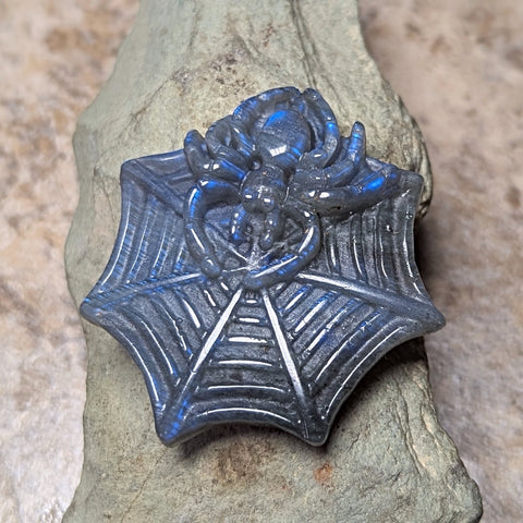 Labradorite Spider Web Carving~CRLABSWB. Spider is the symbol for the infinite possibilities of creation. Her eight legs represent the four winds of change and the four directions of the medicine wheel. If Spider has dropped from her web into your cards today, she may be telling you to create, create, create! Look for new alternatives to your present impasse. She can also be warning you that you are coming too close to an entangling situation. Spider could be asking you to use a journal to write out and review your progress. If you do this, you will not forget how you are creating a new of different phase in your life. Spider brings a message of a different kind when she sees you becoming a bit too involved in the weaving of your life plans to notice opportunity at the outskirts of your web. If this is the case, Spider gets your attention so that you notice that something you have woven has borne fruit. Congratulations! Spider caught you just in time, before you missed the opportunity on the edge of your web of reality. Labradorite reminds us that thoughts create reality, and positive thinking creates positive emotional states. It is thought to connect one to extraterrestrial energies. It clears, balances, seals and balances the aura. It is said to "shine a light" of illumination on our souls destiny and avocation; to remember your magic, and encourages one to progress upon that path. It is a stone of the mental body, rationality, discernment, and intuition. 49mm x 47mm x 11mm.