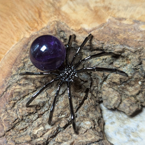 Amethyst Spider~CRASPDR1. Spider is the symbol for the infinite possibilities of creation. Her eight legs represent the four winds of change and the four directions of the medicine wheel. If Spider has dropped from her web into your cards today, she may be telling you to create, create, create! Look for new alternatives to your present impasse. She can also be warning you that you are coming too close to an entangling situation. Spider could be asking you to use a journal to write out and review your progress. If you do this, you will not forget how you are creating a new of different phase in your life. Spider brings a message of a different kind when she sees you becoming a bit too involved in the weaving of your life plans to notice opportunity at the outskirts of your web. If this is the case, Spider gets your attention so that you notice that something you have woven has borne fruit. Congratulations! Spider caught you just in time, before you missed the opportunity on the edge of your web of reality. Amethyst bestows stability, strength, invigoration, and peace; the peace being the perfect peace which was present prior to birth. Because of the calming effect it is an excellent stone for meditation. It promotes fairness and flexibility in decisions and enhances the ability to manage responsibilities. It helps sooth ones temperament, and helps ones business prosper. Amethyst aids in opening ones mind to new ideas, new emotional attitudes, and new depths of spirituality. It is said to encourage sobriety, and is helpful for freeing one from addictive personalities. The message of amethyst is to pay attention to messages your Higher Self may be sending you, maybe a new book, new job, new relationship-with another, with yourself, or with your spirituality, and to be open to Divine guidance. 58mm x 46mm x 20mm
