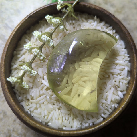 Citrine Moon~CRCITM02. Citrine is said to assist one in acquiring wealth, and maintaining the state of wealth. It activates, opens, and energizes the navel and solar plexus chakras, directing, via personal power, creativity, and intelligent decisiveness, the energy necessary to enhance the physical body. It stimulates both mental focus and endurance. It can help one to dispense with the fundamental level of fear. It further promotes a radiance from within the self, culminating in a more consistent happy disposition. It brightens even the darkest corner of ones perceived reality, and helps one to "laugh without restraint". It is an excellent stone for smoothing family or group problems and, subsequently, producing cohesiveness within the associative members. Citrine is also wonderful for workers in the media and the arts, and is very good for automatic writing(where you ask a question and allow your hand to write freely, or write with your non-dominant hand). It reminds us that we are loved and supported by the Universe in our efforts towards manifestation. 52mm x 40mm x 22mm