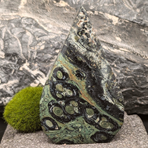 Kambaba Jasper "Flame"~CRKJGSF4. Kambaba Jasper (Green Stromatolite) is fossilized algae & is the primary constituent of the fossil record for about the first 3.5 billion years of life on Earth, they are almost our only glimpse into deep time on earth, the emergence of life, and the evolving of the beautiful forms of life of modern time, a small piece of stromatolites encodes biological activity perhaps spanning thousands of years, aids past-life meditation, said to relieve physical and emotional stress & reestablish the flow of body fluids that have become heavy, blocked, or dried, is said to mystically soothe the nerves and state of mind, good for grounding and protection, beneficial for plant growth and health, helps dietary stabilization, assimilation of vitamins and minerals, and cleansing the body of toxins. 78mm x 48mm x 16mm