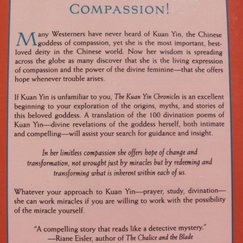 Kuan Yin Chronicles-Martin Palmer . Kuan Yin is the most important, best-loved deity in the Chinese world. She is the living expression of compassion and the center of devotion in most Chinese homes and workplaces. The authors reveal that Kuan Yin is the mystery and power of the divine feminine, who transcends all doctrines, creeds, and traditions. The book is divided into three sections:The origins and evolution of Kuan Yin in early China, Buddhism, Taoism, and shamanism.