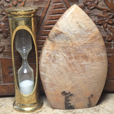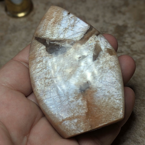 Peach Moonstone with Smoky Quartz "Flame"~CRPMFLM4. Shimmery Peach Moonstone with Smoky Quartz is said to help calm responses and avoid overreaction, helping one feel balanced during changing aspects in your life. It enhances feminine energies, sensitivity, intuition, and psychic abilities; a highly intuitive stone allowing self expression and creativity to flow. It is also associated with love of all kinds. When the moon is waning it helps one to look into the future. It opens up the Heart and allows the energy to heal the lower Chakras. It can be especially helpful for Indigo children. Smoky Quartz is an excellent grounding stone, it helps one to be present in one’s body and the world. It transmutes negative energies in one’s environment, and is said to be protective from EMF's. It is a good stone for “keeping things clear” by purging the atmosphere of unspoken resentments or suppressed conflicts. It can help one feel more at home in the world and empowered in creating or changing one’s reality. 93mm x 61mm x 24mm.