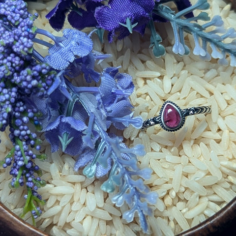 Sterling Silver Adjustable Pyrope (Purple Garnet) Garnet Ring~JSSRPGAR. Adjustable from size 5 to 9. Note your size in notes during checkout and we will pre-size, you can fine tune. Pyrope Garnet is concerned with the protection of the base and crown chakras and in maintaining the rhythms of the subtle bodies in synchrony with the other aspects of consciousness. It provides for a connection between the grounding force of the base chakra and opening to inner wisdom which is associated with the crown chakra. It has also been quite conducive to the art of manifestation, bringing that which is desired and needed ( Note the qualification of this property- both conditions need to be met in order for the energy to facilitate the manifestation). It assists with the unification of the creative forces of the self.