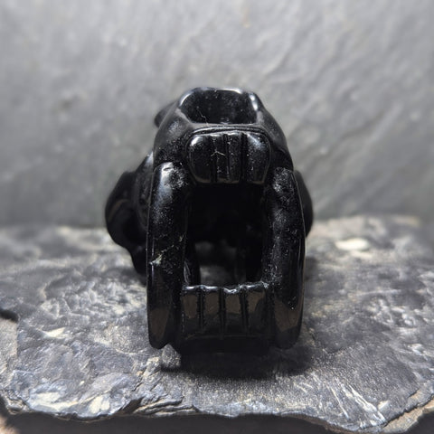 Obsidian Saber Tooth Tiger Carving~CROSSTTC. Smilodon, also know as Saber Tooth Tigers went extinct roughly 10,000 years ago. Many of the common names we use for cats have broad associations such as “panther” “wild cat” or “leopard” (such as “snow leopard” and “clouded leopard”) and these names do not indicate close relationships but instead are more descriptive of what the animal looks like. When fossils of Saber-toothed Cats were discovered, scientists attempted to compare them with animals that they were more familiar with. Tigers are amongst the oldest of the big cats, they are the largest cats alive today, and have the biggest teeth. Smilodon itself is the general name for three separate related species: Smilodon populator, Smilodon fatalis, and Smilodon gracilis. Despite their name, they’re not closely related to tigers or other big cats in the genus Panthera, which also includes lions, leopards, and jaguars. The three species mostly differ in size—while Smilodon gracilis typically weighed in at around 55-100 kg (100-220 lbs), Smilidon fatalis tipped the scales at 160-280 kg (350-600 lbs); approximately the same weight as a Siberian tiger. Obsidian is a natural volcanic glass, formed when lava solidifies so quickly that mineral crystals do not have time to grow. It is said to act to cleanse the energetic field or aura of disharmonious energy, densities, and negative attachments. It is thought to be very grounding and protective and also assist one in choosing behaviors that are only for one's highest good. Obsidian has also been used for scrying, or crystal gazing. A strongly protective stone, Obsidian forms a shield against negativity, providing a grounding cord from the base chakra to the center of the earth. It absorbs negative energy from the environments and blocks psychic attack and negative spiritual influences. Obsidian brings clarity to the mind and clears confusion. Providing deep soul healing, Obsidian goes back to past lives to heal festering emotions or trauma carried forward into the present, bringing depth and clarity to emotions. 94mm x 56mm x 56mm.