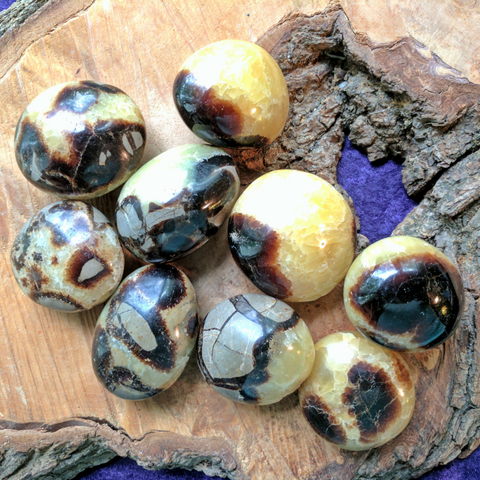 Septarian Nodule Palm Stone~CRSNPMST. Septarian nodule is a concretion comprised of limestone, aragonite, and calcite that started their formation approximately 150 million years ago. It is said to direct the energy of various drum journeying and drum healing techniques. It is considered an ally for staying centered during times of intense emotions. It is thought to assist one with public speaking. One Septarian Nodule Palm Stone. Avg. size 58mm x 42mm x 30mm